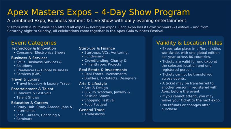 Apex Master Exposs are where visionaries and game-changers come together to spark innovation. They're fast-paced, energy-driven events packed with opportunities to grow, collaborate, and elevate your business. Get ready for an unforgettable experience that pushes boundaries and ignites success!